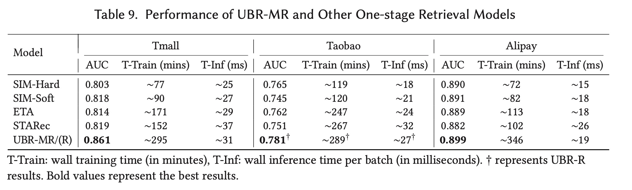 在本节中,我们从有效性和复杂度方面比较了 UBR-MR 和 one-stage retrieval models 。我们在 Table 9 中列出了test AUC 、训练时间、以及推理时间。T-Inf 是模型完成一个 batch 测试样本的计算的 wall time。