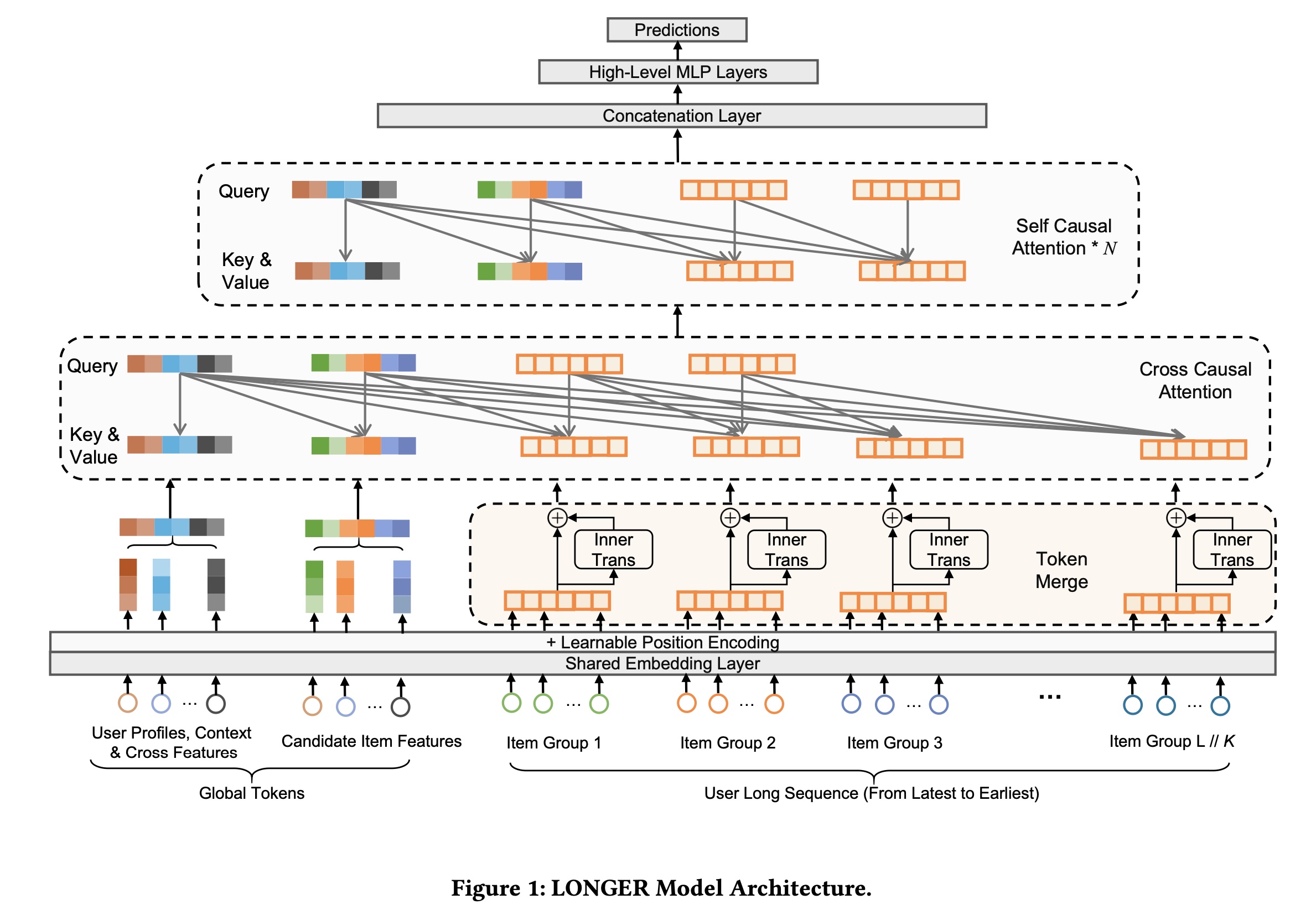 为此,我们提出了 Long-sequence Optimized traNsformer for GPU-Efficient Recommenders: LONGER。在该框架中,我们将 sequence input 组织为 global tokens(来自于 non-sequence features) 和 raw sequences(来自于 sequence features),基于此,开发了一种基于 inner-transformer 的 token merge 方法,以有效减少计算预算。此外,由于用户的超长序列中通常存在大量噪声,我们利用高效的 hybrid attention 策略来提高计算效率,同时保持模型性能。此外,为了在拥有十亿用户规模的 industrial level 全面部署 LONGER,我们提出了一系列工程优化,包括 a fully synchronous training and serving framework with mixed-precision and activation recomputation,以及 a KV cache serving strategy。总的来说,贡献主要总结如下: