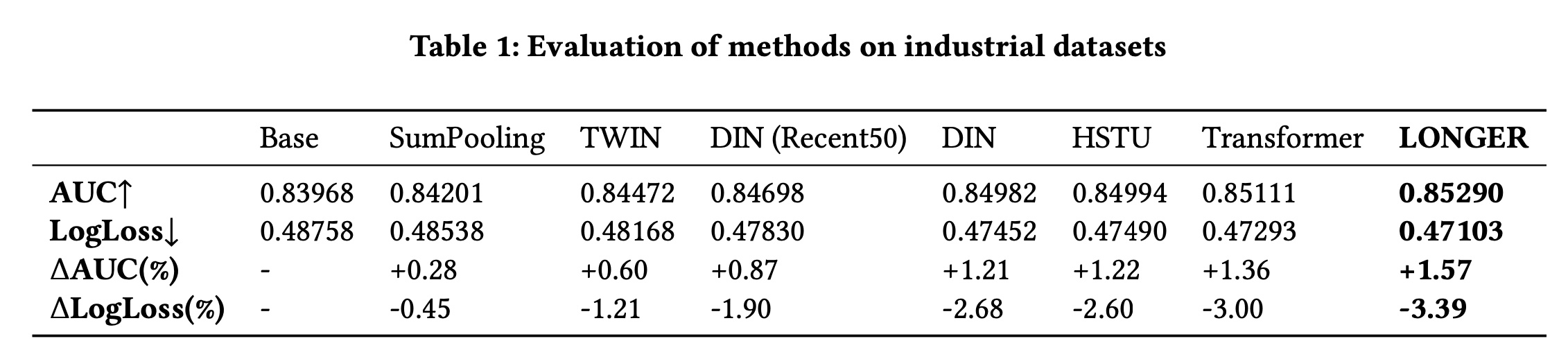 现有方法比较:我们使用推荐系统中二分类的两个标准指标:AUC (Area Under the ROC Curve) 和 LogLoss,在 offline evaluation set 上报告模型性能。Table 1 总结了多个基线和我们提出的模型的结果。