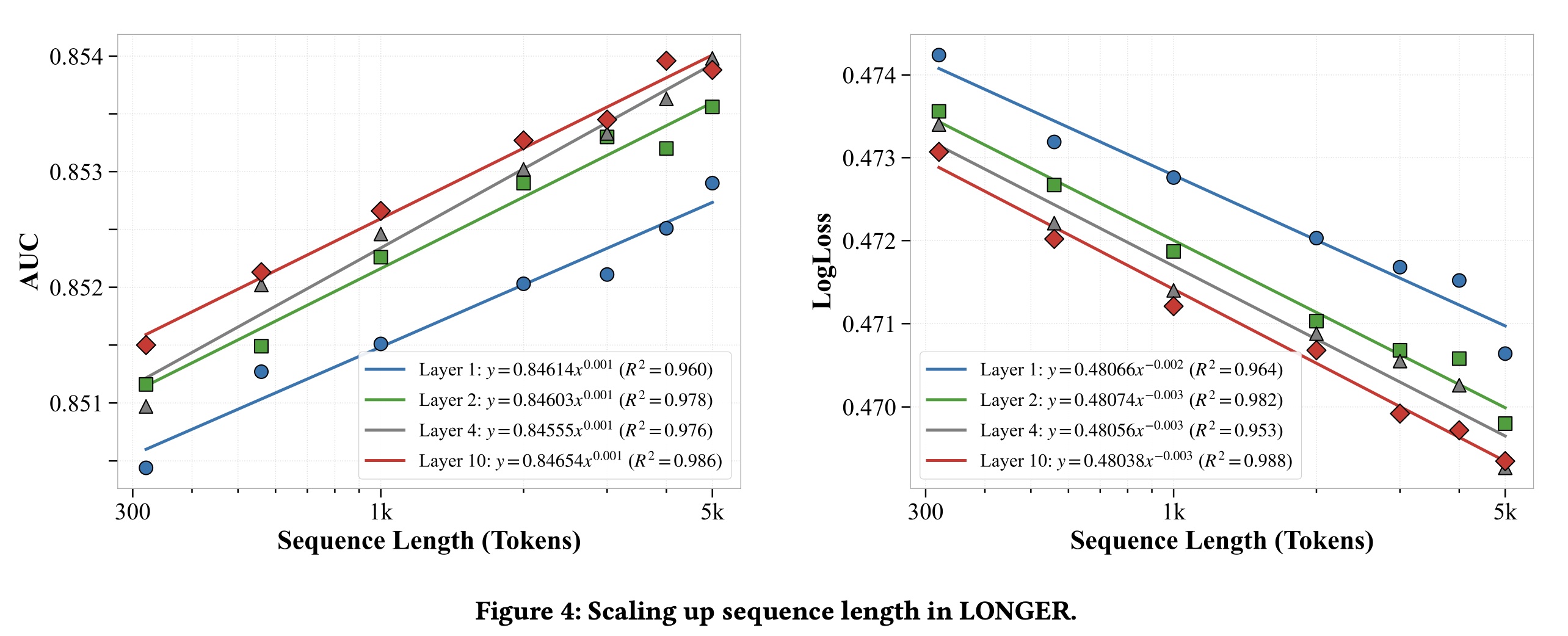 Deeper models 从 longer sequences 中受益更多,但 AUC 的改善随 depth 增加而减慢,表明收益递减。optimal depth 应平衡 model capacity 和 computational constraints 。