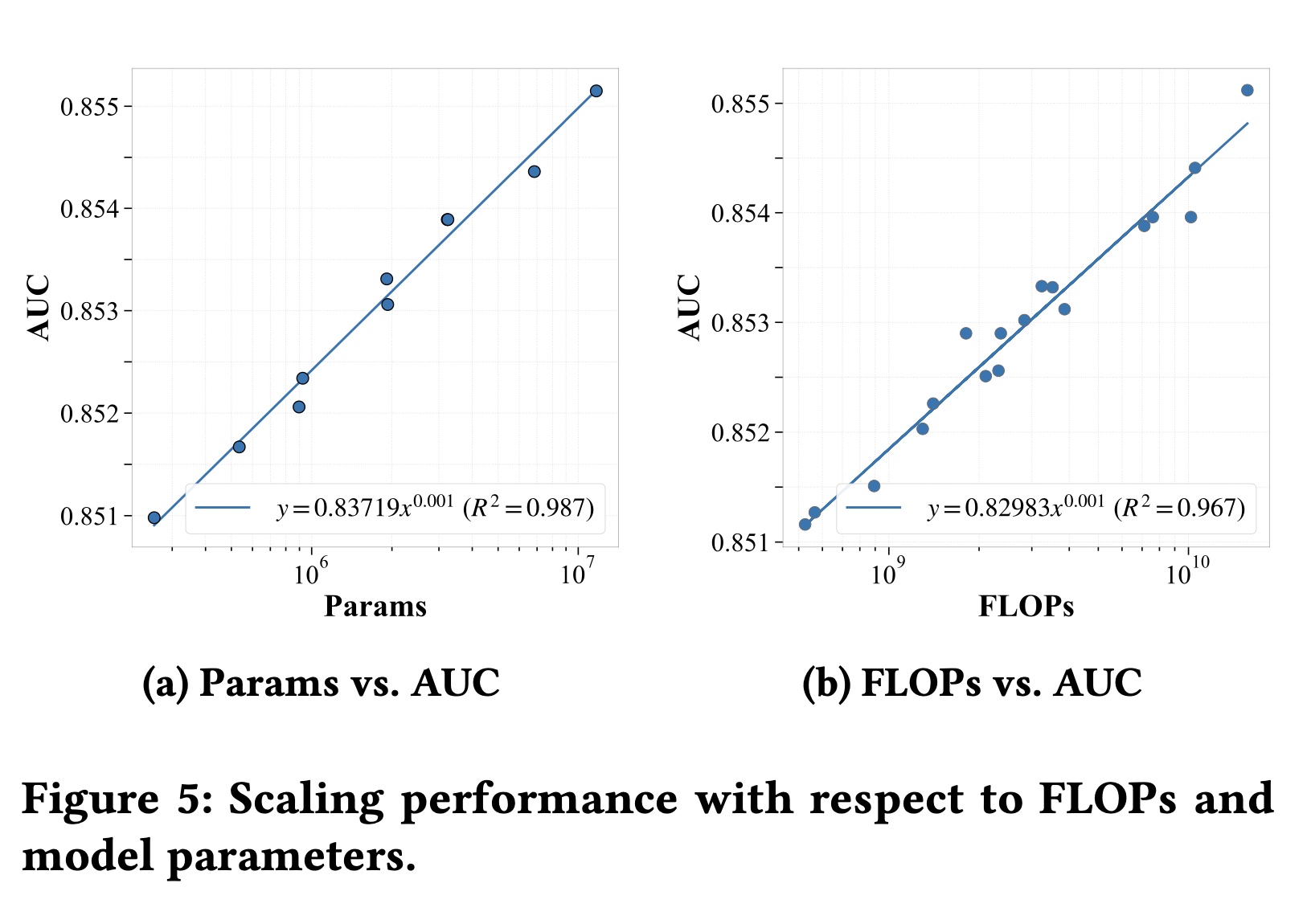 FLOPs:我们通过改变 number of layers 和 sequence length 来分析模型性能,同时将模型维度固定为 32。如 Figure 5(b) 所示,AUC 随着 FLOPs 的增加而稳步增长,遵循强 power-law 趋势 (user behavior sequences ,捕获更高阶的依赖关系并提高预测准确性,即使在固定模型 width 下也是如此。