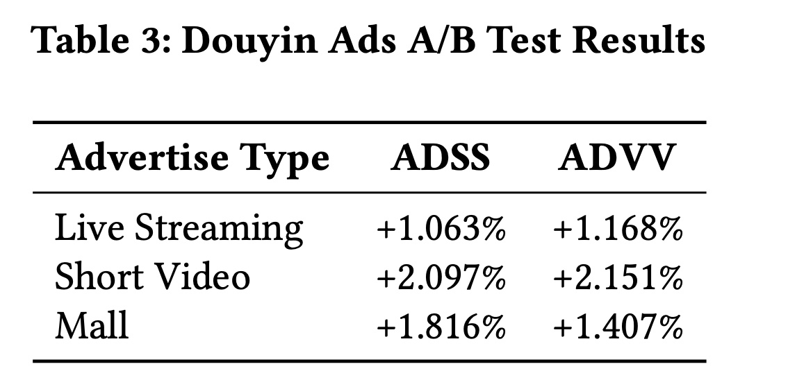 Douyin Ads Platform:本节展示了Douyin Ads 上 A/B test 的结果,我们使用两个关键指标评估我们模型的性能:ADSS (Advertiser Score) 和 ADVV (Advertiser Value),这两个指标是工业广告系统中最重要的指标。测试在三种广告格式上进行:直播(Live Streaming)、短视频(Short Video )和商城(Mall )。