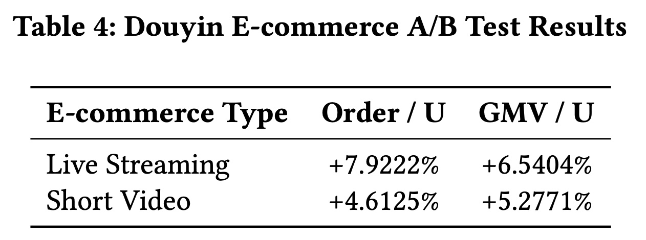 Douyin E-Commerce Service:对于 Douyin E-Commerce 上的 A/B test,我们使用两个关键指标评估不同内容格式的有效性:Order/U (每用户的订单数)和 GMV/U (每用户的 GMV)。这些指标帮助我们理解模型不仅对总销售额的影响,还对 user-level engagement 和 user-level value generation 的影响。结果显示两个指标均有显著改善。