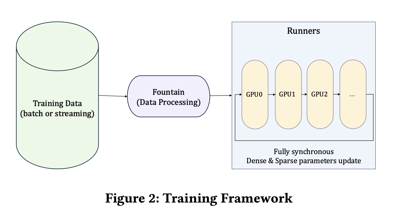 Training Framework:我们的训练框架是一个为 large-scale sparse models 设计的全同步系统(fully synchronous system),旨在利用现代高性能 GPU 的能力。基于硬件--软件协同设计(hardware–software co-design)的理念,它旨在最大化distributed training 中的计算吞吐量和内存效率。training pipeline 始于 batch form 或 streaming form 的数据摄入,然后通过 Fountain 模块进行预处理。处理后的 training data 随后被分发到多个 GPU runners,在那里 dense parameters 和 sparse parameters 都被同步地更新。这种 unified design 促进了跨 devices 和 nodes 的有效 scaling,为在生产环境中训练 large-parameter models 提供了坚实的基础。