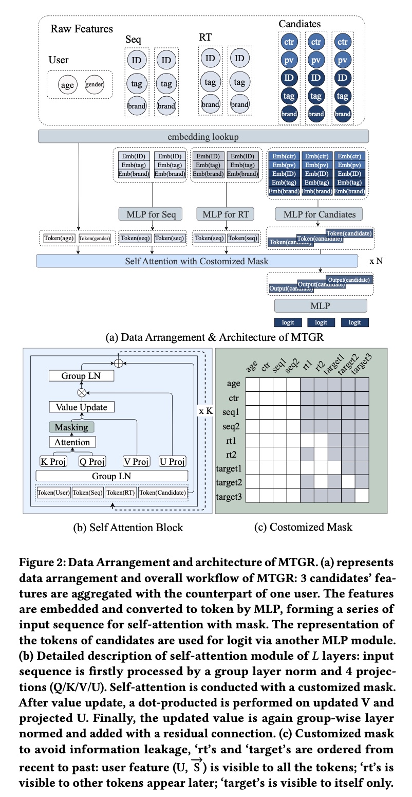 MTGR 采用与《Actions speak louder than words: Trillion-parameter sequential transducers for generative recommendations》 中类似的 Hierarchical Sequential Transduction Units: HSTU 架构进行建模。在 HSTU 中,我们提出 Group-layer Normalization: GLN,对不同类型的 token 分别进行归一化,从而能够同时更好地建模多种异构信息(multiple heterogeneous information)。此外,我们提出动态掩码策略(dynamic masking strategy),通过 full-attention、auto-regressive 和 visibility only to itself 三种掩码模式,确保模型性能并避免信息泄露。