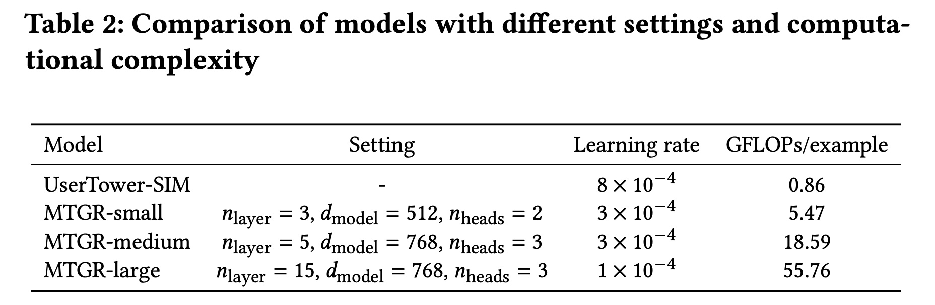 MTGR 采用 E2E 处理所有 sequence information ,并设置了三种不同规模以验证 scalability ,如 Table 2 所示。