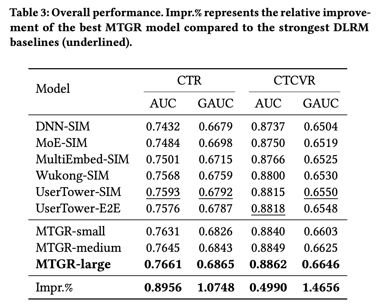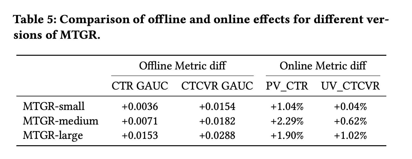 我们使用 10-day dataset 评估 MTGR 和其他基线方法的性能,结果如 Table 3 所示。不同模型在各离线指标上的差异的趋势一致。根据以往经验,离线指标提升 0.001 即被认为具有显著意义。