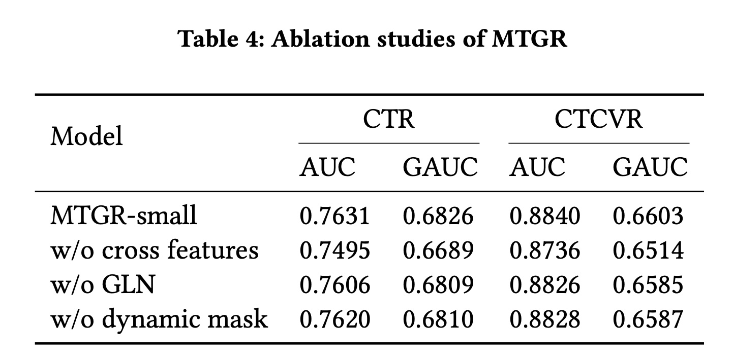 移除其中任何一个组件都会导致性能显著下降,下降幅度与 MTGR-small 到 MTGR-medium 的性能提升幅度相当。这表明 Dynamic Masking 和 GLN 对 MTGR 至关重要。