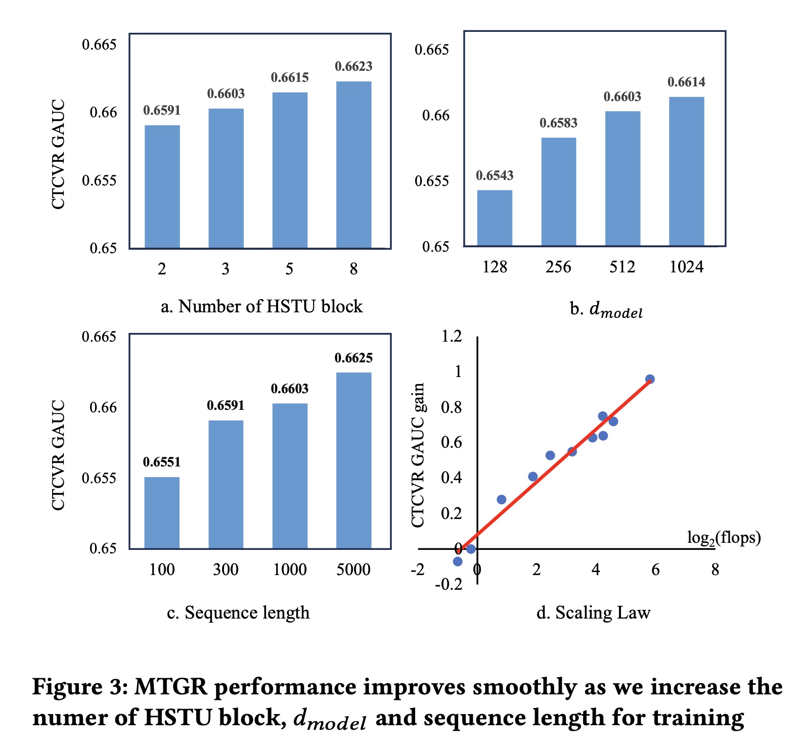 Figure 3 展示了 MTGR 的 scalability :我们基于 MTGR-small ,对三个不同超参数(HSTU blocks 数量、模型维度 input sequence length )进行了测试。可以看出,MTGR 在不同超参数下均展现出良好的 scalability 。