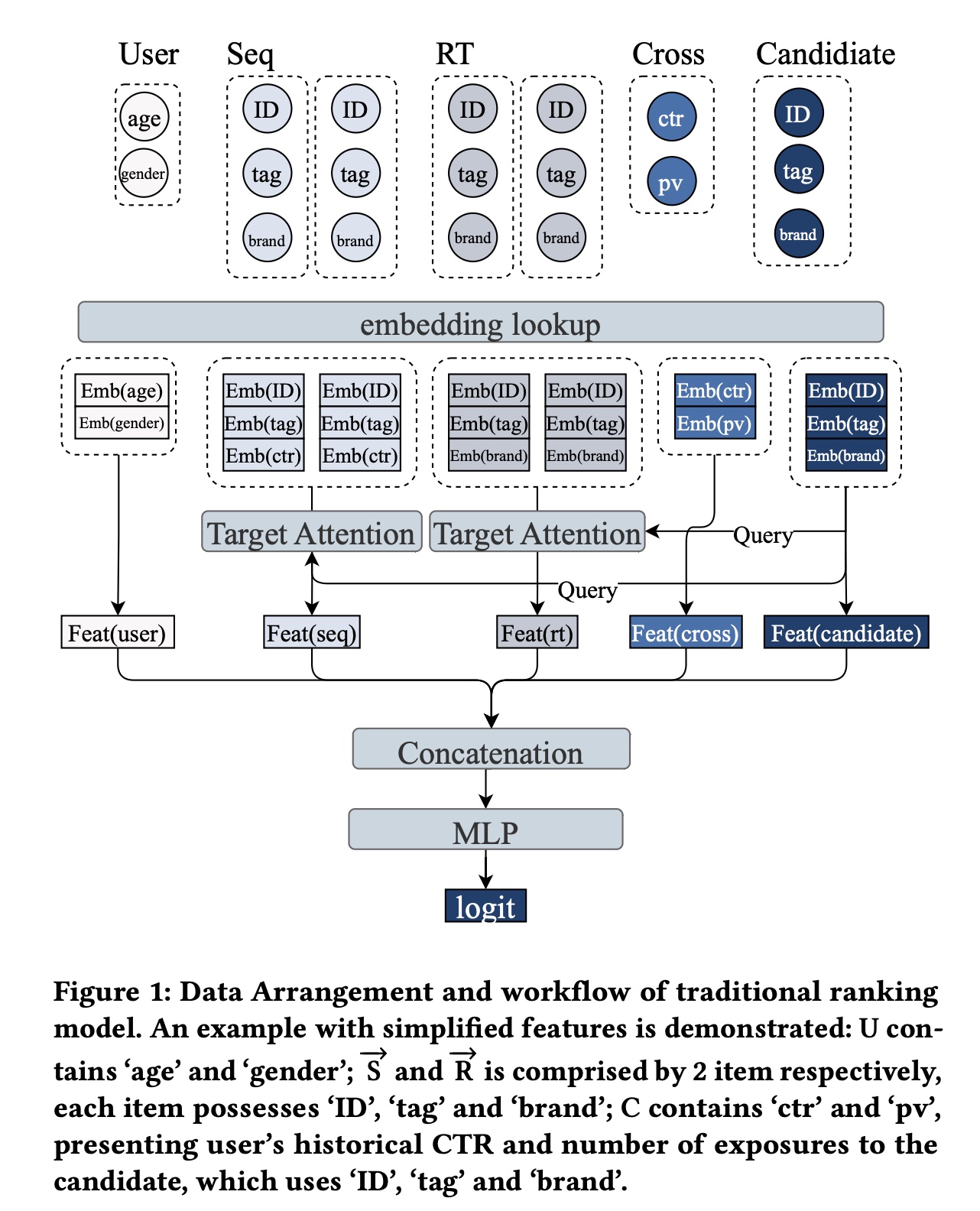 Figure 1 展示了传统 ranking model 的简化的 data arrangement 和 workflow: