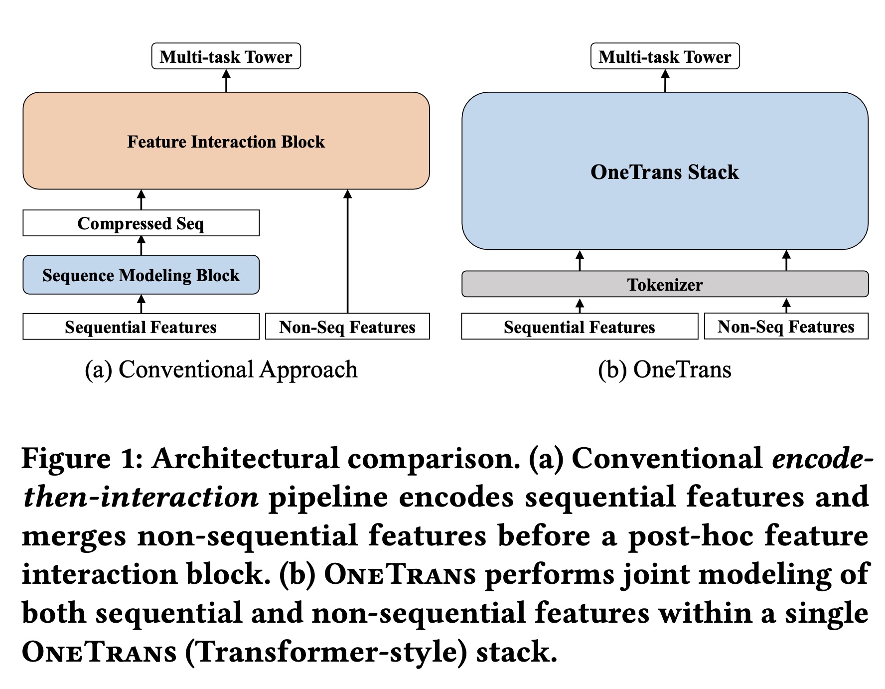 本文提出 OneTrans ,一种用于 personalized ranking 的 unified Transformer backbone ,以替代传统的 encode–then–interaction 架构。
