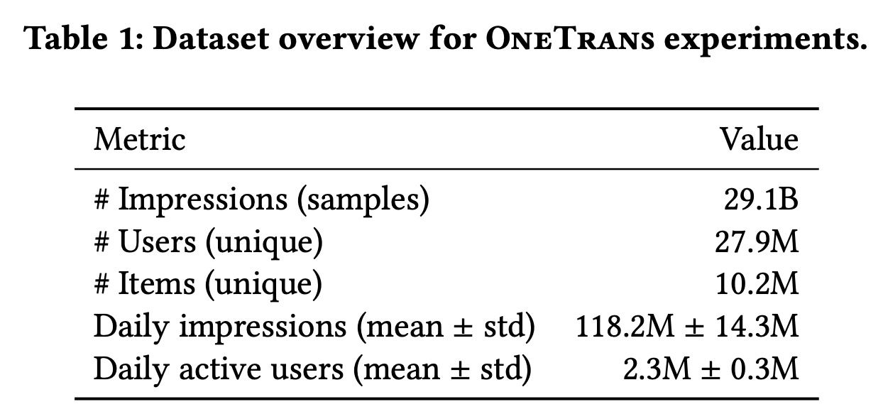 数据集:对于离线评估,我们在大规模工业排序场景中使用生产日志评估 OneTrans,严格遵守隐私合规要求(所有个人身份信息均经过匿名化和哈希处理)。数据按时间顺序分割,所有特征均在 impression 时刻被快照,以防止时间泄露并确保 online-offline 一致性。label(如 clicks 和 orders)在与 production settings 对齐的 fixed windows 内聚合。Table 1总结了数据集统计信息。ho