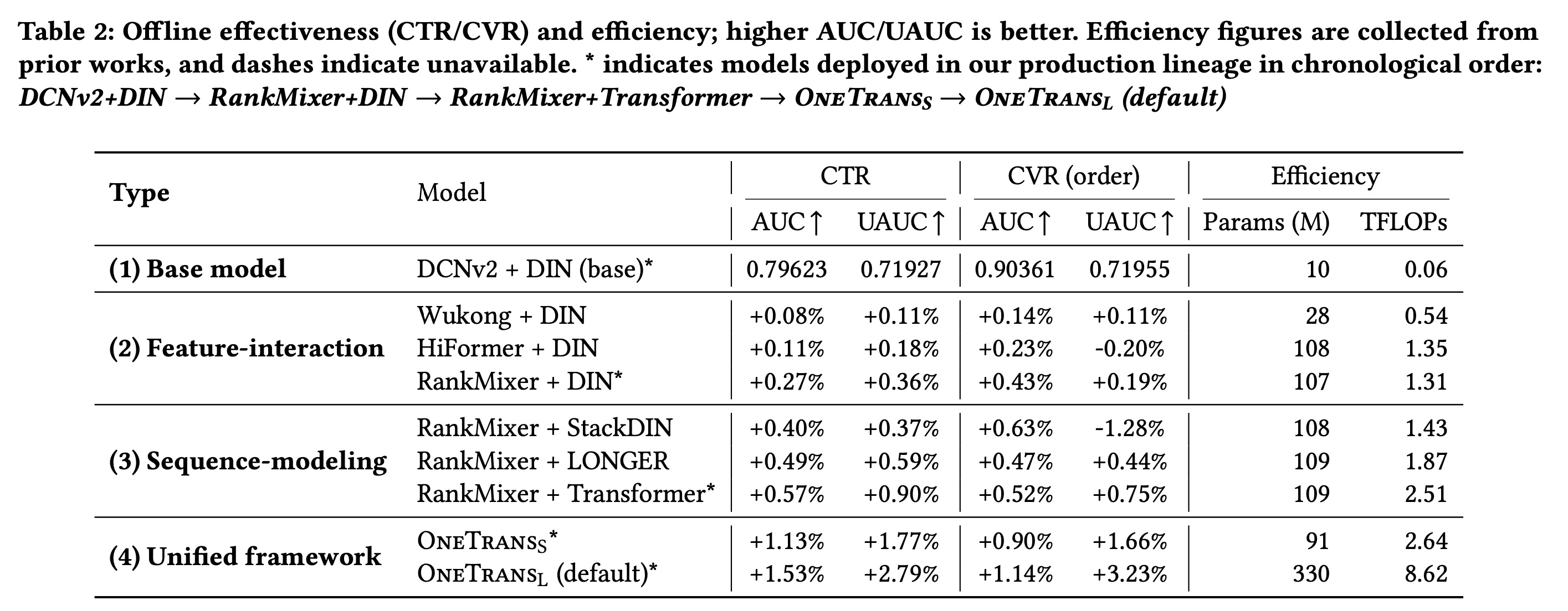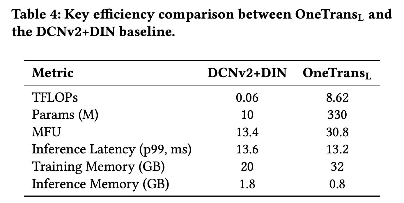 这些结果共同表明:OneTrans 在参数和计算方面更高效,为工业部署提供了更优的 performance–compute 权衡。