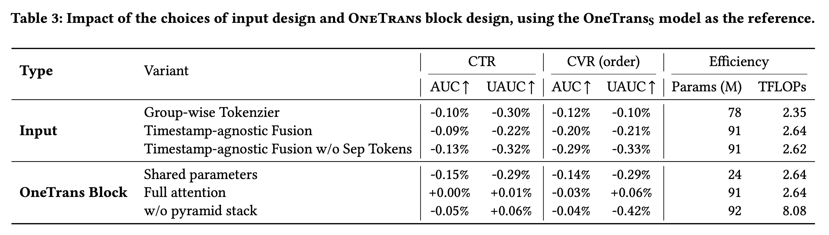 RQ2:哪些 design choices 至关重要?通过对 input layer(如 tokenizer、sequence fusion)和 OneTrans block(如 parameter sharing、attention type、pyramid stacking)进行消融实验,评估不同 design choice 对性能和效率的重要性。