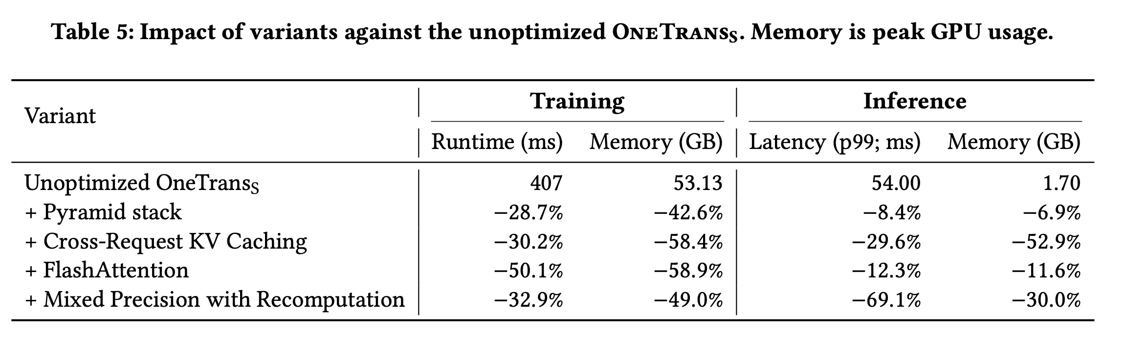 RQ3:系统效率:pyramid stacking、cross-request KV Caching、FlashAttention-2 以及 mixed precision with recomputation,在相同 OneTrans graph 下是否能减少 FLOPs/memory 和 latency ?