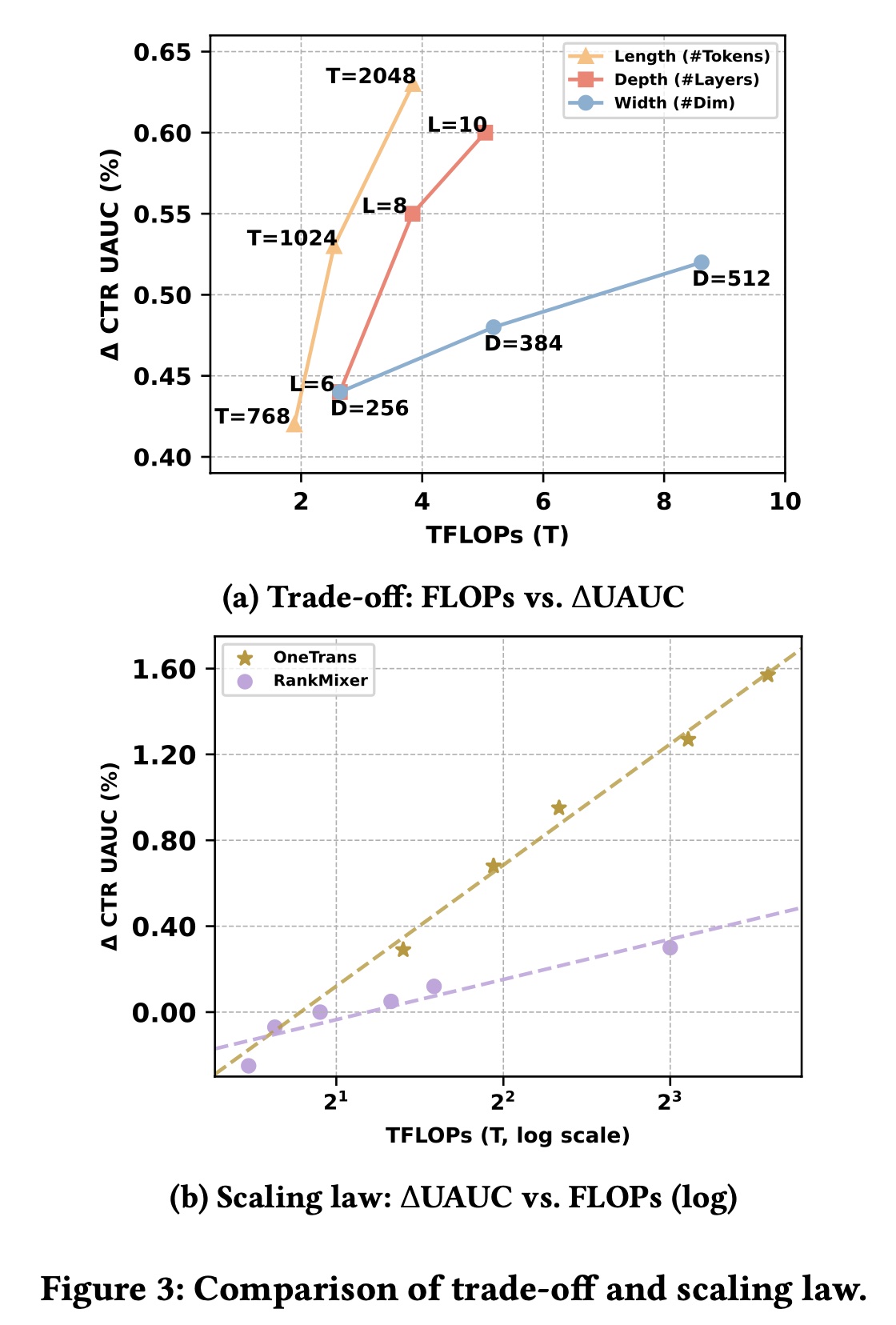我们通过同时增加 OneTrans 的宽度和深度,进一步分析 scaling-law 行为。为进行比较,我们还将 RankMixer+Transformer 基线在 RankMixer 侧扩展至 1B 参数;然后在对数尺度上绘制 UAUC 增量(training FLOPs 的关系。如 Figure 3(b) 所示,OneTrans 和 RankMixer 均呈现明显的 log-linear 趋势,但 OneTrans 的斜率更陡——这可能是因为 RankMixer 主导的 scaling 缺乏 a unified backbone ,其 MoE-based expansion 主要增加了 FFN 的 hidden dimension 。