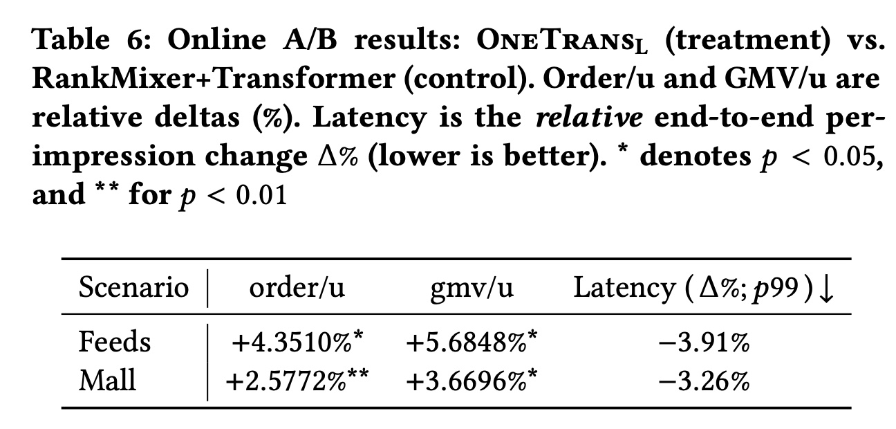 RQ5 :Online A/B Tests :在 production latency 约束下,在线部署 OneTrans 是否能在关键业务指标(如 order/u 、GMV/u )上实现显著提升?