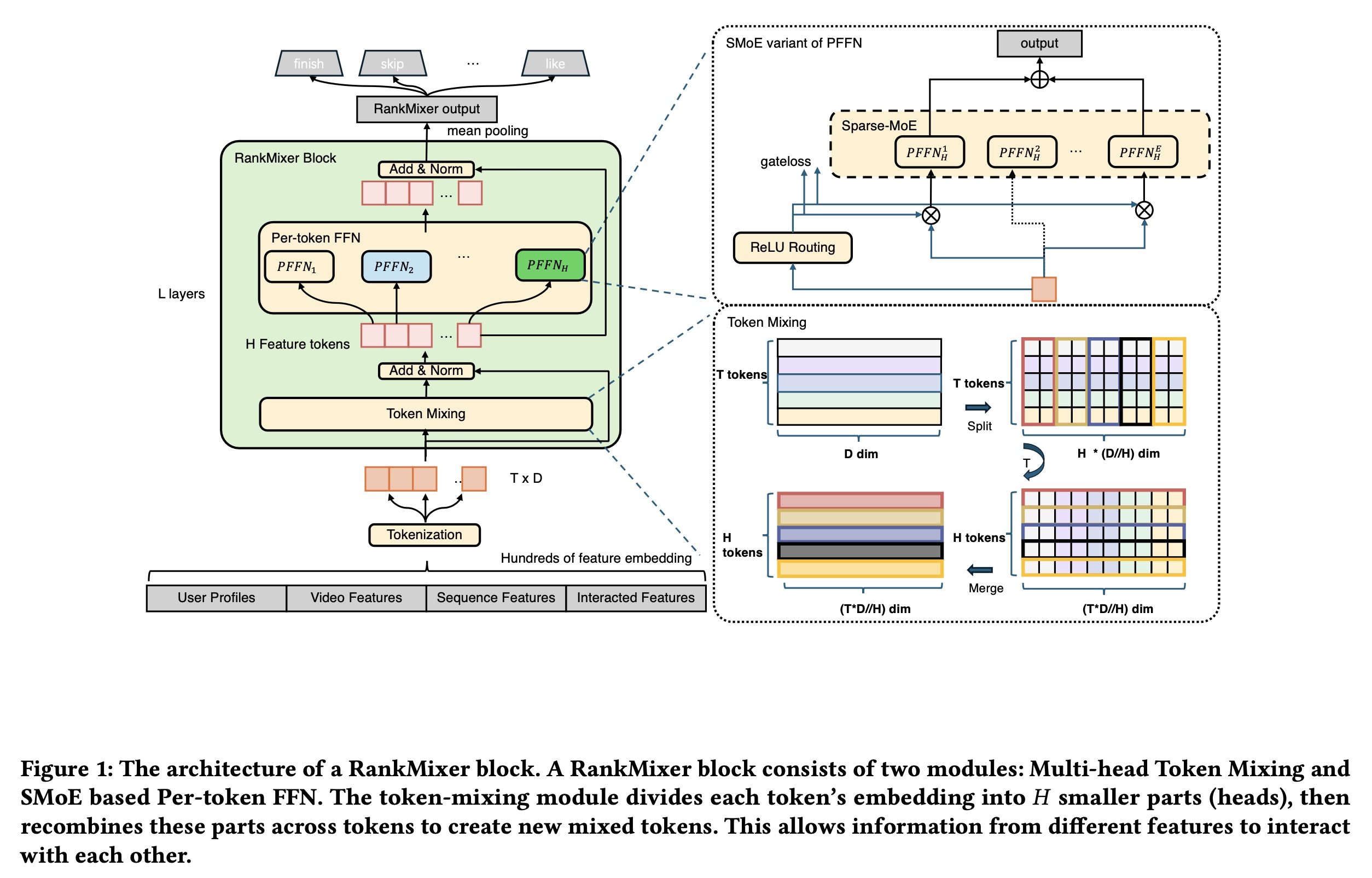 我们提出了一种名为 RankMixer 的新架构,遵循硬件感知的模型设计理念。我们设计了 multi-head token mixing 和 per-token FFN 策略来高效地捕获 heterogeneous feature interactions,并使用动态路由(dynamic routing)策略来提高 RankMixer 中 SparseMoE 的 scalability。