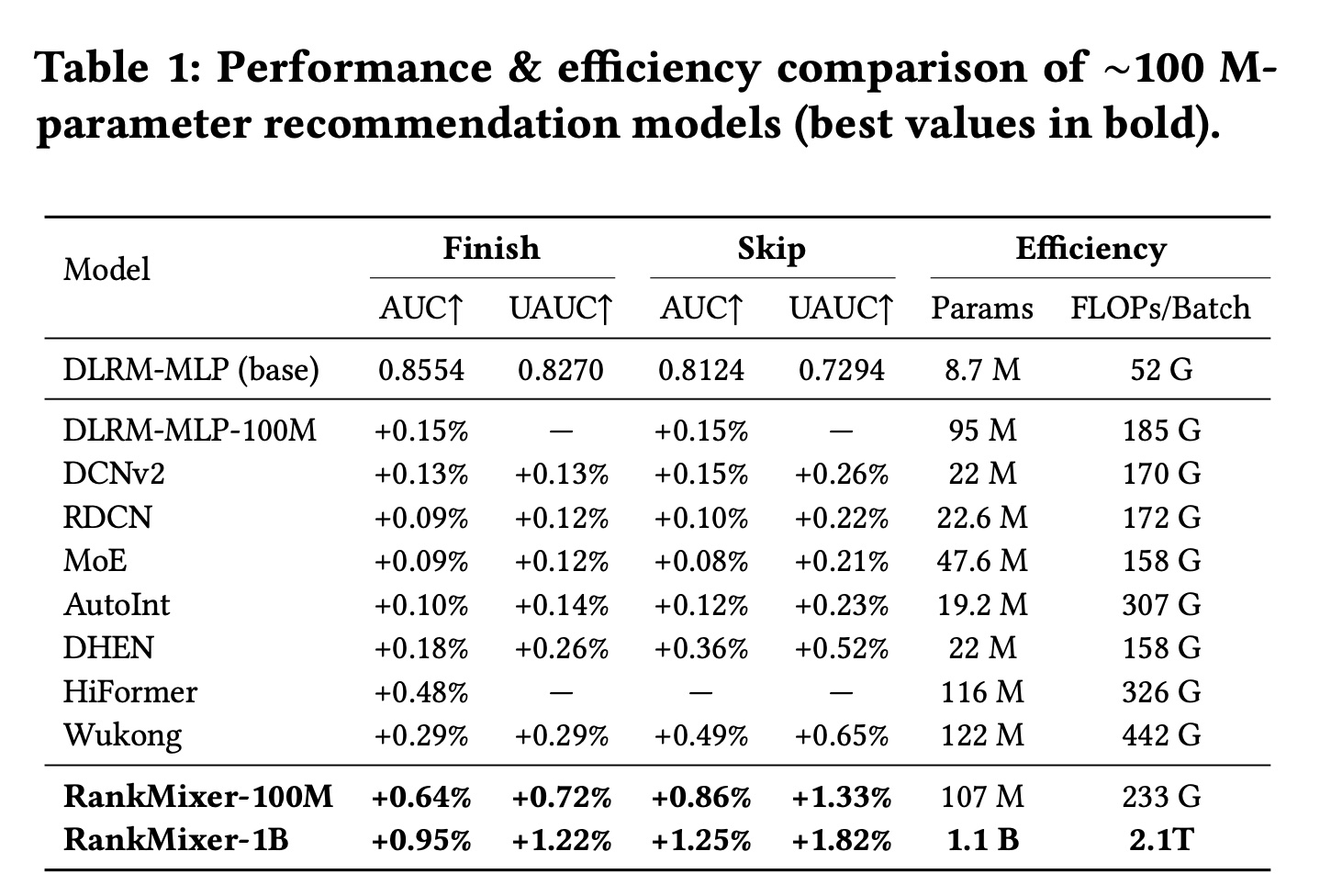 我们如何防止 inference latency 随着参数增加两个数量级而爆炸?在实际系统中,latency 与吞吐量成反比,与 serving machine resources 的成本成正比。与我们之前的 fully-deployed 16M-parameter model(采用集成了 DLRM 和 DCN 的结构)相比,我们的 RankMixer 模型将参数扩展了约 70 倍至 1B。尽管参数显著增加,但由于我们 hardware-aligned 的模型设计和 optimization 策略,最终 inference latency 保持稳定。
