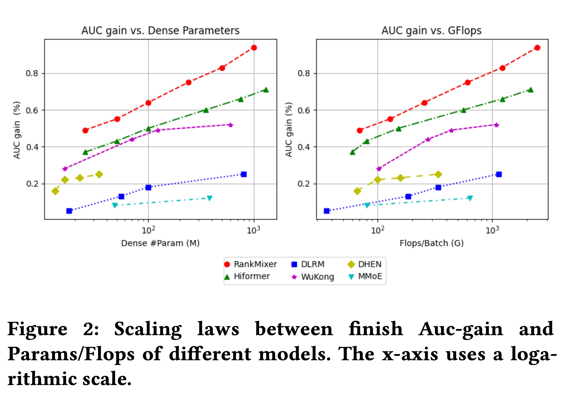 在 Figure 2 中,我们展示了从参数大小和 Flops 观察到的 scaling law 曲线。RankMixer 模型在参数和 FLOPs 方面都显示出最陡峭的 scaling law。RankMixer 始终优于其他模型。