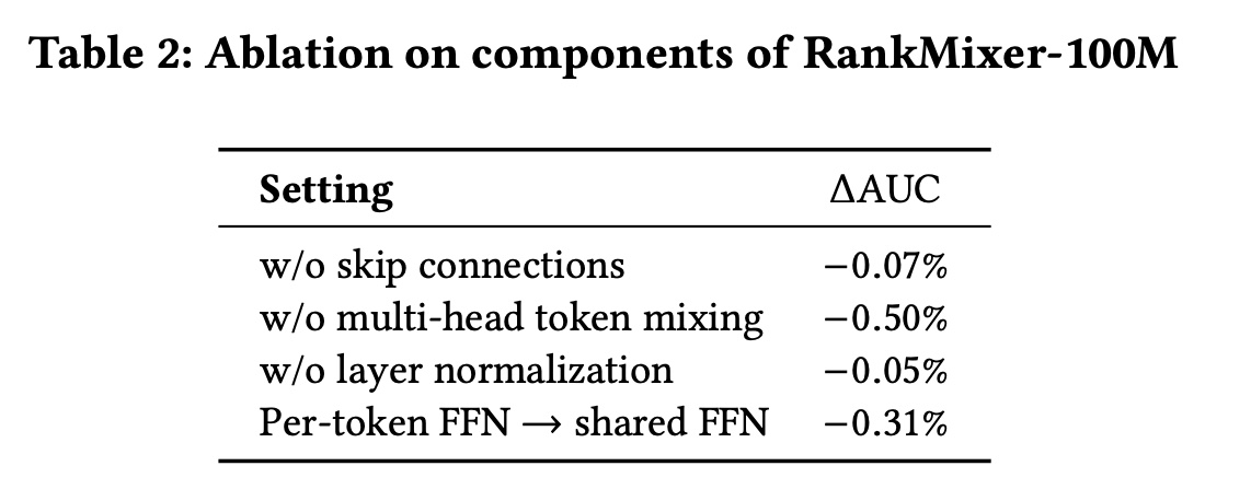 在 RankMixer-100M 模型中,我们对 residual connections、Multi-Head Token-Mixing 进行了消融研究。从 Table 2 中,我们可以看到:移除这些组件显著降低了模型的性能。