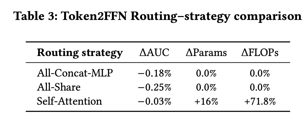 我们进一步分析了 token mixing 策略,即从 feature tokens 到 FFNs 的 routing 策略,见 Table 3。与 Multi-Head Token Mixing 比较的 routing 策略包括: