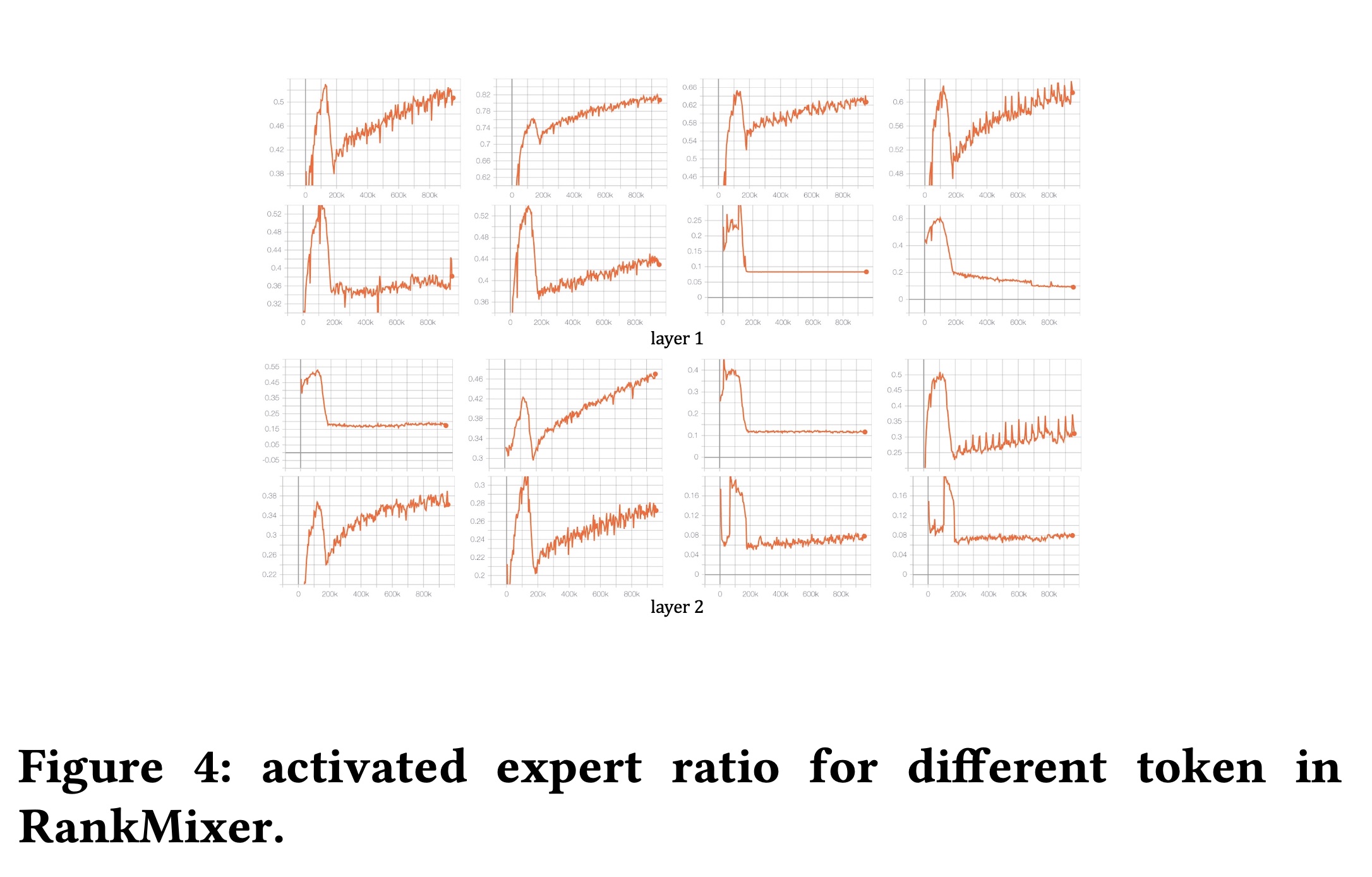 添加 load-balancing loss 相对于原始Sparse-MoE 减少了性能下降,但仍然不及 DTSI + ReLU 版本,因为问题主要在于 expert training 而不是 router。这验证了 Sparse-MoE 作为将 RankMixer 从当前的 1B 参数扩展到未来 10B 规模部署而不超出成本预算的路径。