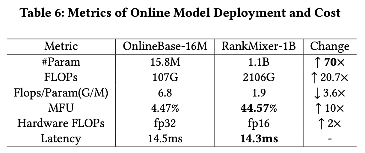 在抖音的推荐系统的生产部署中,我们证明了在与先前 baseline 相比延迟更短的情况下,将模型参数扩展 100 倍以上是可行的。这得益于 RankMixer 架构能够将 parameter growth 与 FLOPs 解耦,并通过 high MFU 和 engineering optimization 将 FLOPs growth 与实际成本解耦。