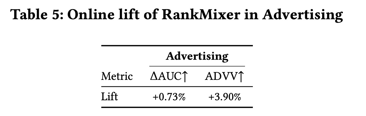 这些结果表明,RankMixer 作为一个 unified backbone ,能够可靠地泛化到不同的应用场景。