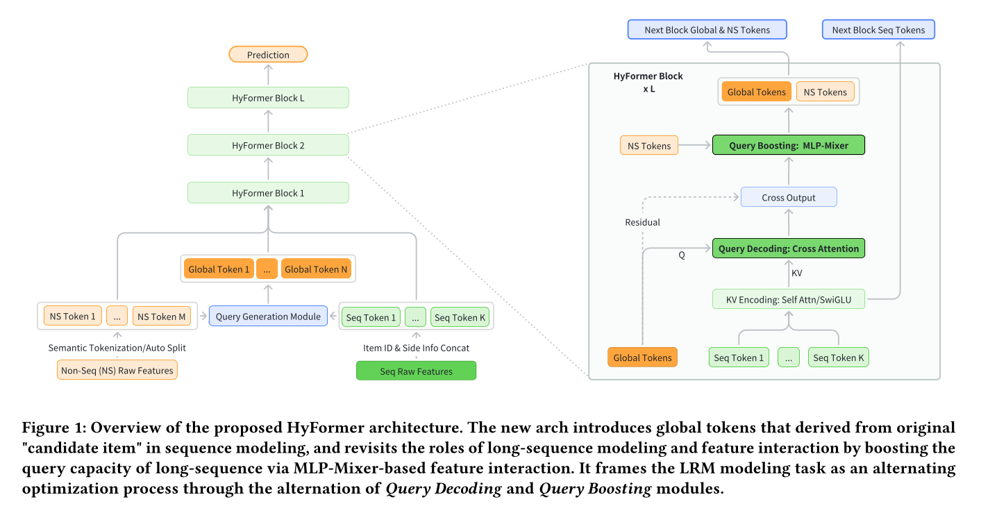 HyFormer 的整体架构如 Figure 1所示。如图所示,每个 HyFormer layer 整合了两种互补机制: