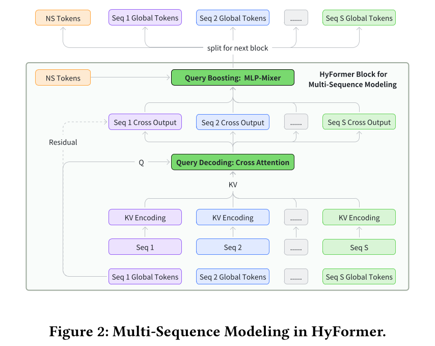 (1):Query Decoding,通过 MLP-based query generation,将 non-sequential and sequential features 扩展为多个 semantic global tokens(即 sequence queries),并对 long-sequence K/V pairs 执行 cross-attention,使 global information 能直接塑造 representation of sequence tokens。