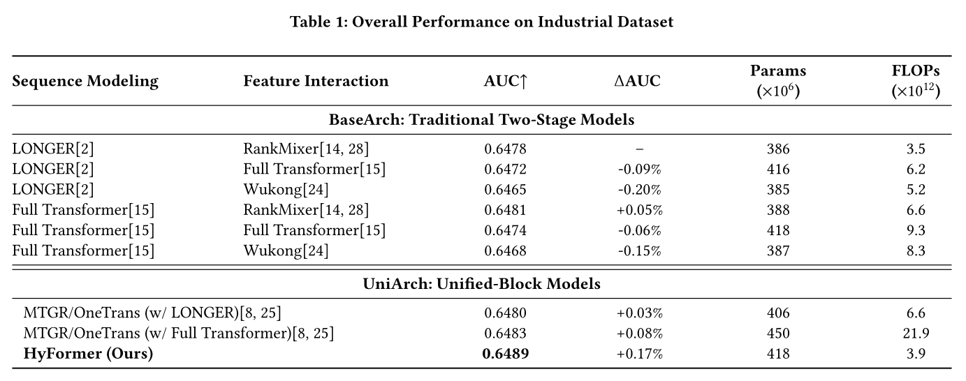 现有方法对比:所提的 HyFormer 架构在所有评估模型中取得了最高的 AUC 值,性能优于传统两阶段模型(记为 BaseArch)和其他 unified-block 模型(记为 UniArch)。结果如 Table 1 所示。