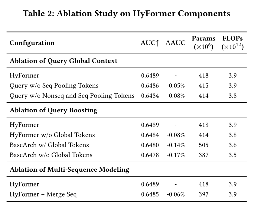 首先,我们对 query 的组成部分进行消融。HyFormer 的 query 由三个来源生成:global non-sequential features、 multiple sequences pooling tokens 和 original target features。实验表明: