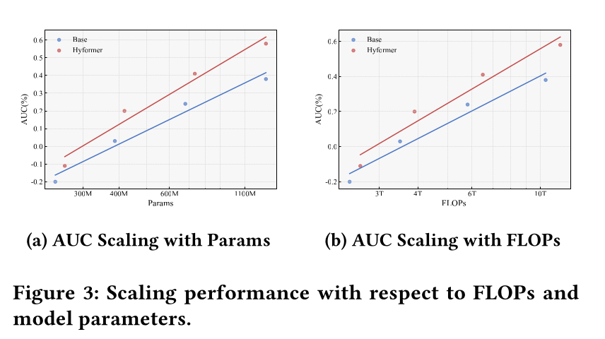 该设计实现了 sequence modeling 与 feature interaction 组件间的信息的双向流动,克服了传统的 decoupled pipelines 的局限性。在十亿级工业数据集上的大量实验表明,在参数量和 FLOPs 相当的前提下,HyFormer 一致地优于性能强劲的 sequence-based and token-mixing baselines。此外,HyFormer 在模型 FLOPs 和参数量方面展现出更优异的 scaling 特性,且在高流量的生产系统中开展的大规模 online A/B tests 中取得了显著的性能提升。