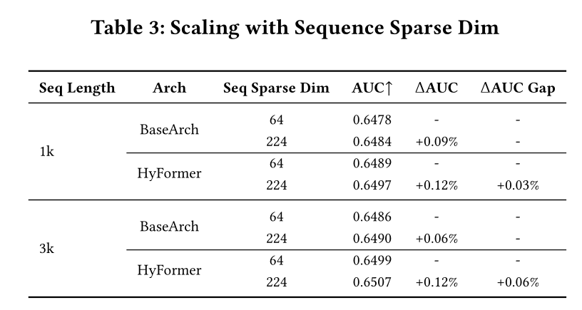 此外,随着序列长度的增加,HyFormer 与传统两阶段模型之间的性能差距逐渐扩大,dimension expansion 带来的额外增益从 1000 序列长度时的 0.03%,增加至 3000 序列长度时的 0.06%。