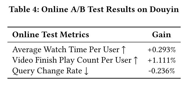 本节展示 HyFormer 模型在 Douyin Search 平台的 online A/B test 结果,对照组为性能强劲的现有 RankMixer 基线模型。在线评估采用三个核心指标:人均平均观看时长(Average Watch Time Per User)、人均视频完播数(Video Finish Play Count Per User)和 Query Change Rate 。其中,Query Change Rate 用于量化用户手动将一个 search query 细化为更具体 search query 的概率(例如从 "iPhone" 修改为 "iPhone 17 Pro"),计算方式如下: