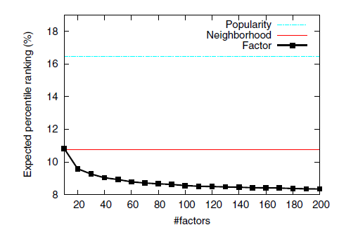 我们考察了不同数量的因子,其中 10 到 200, 在测试集上的结果如下图所示。