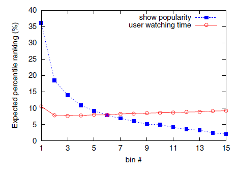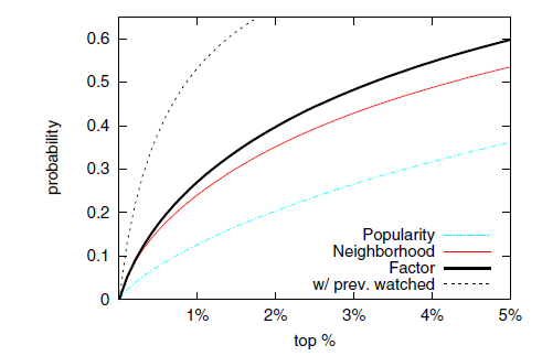 可以看到(红色曲线):除了第一个桶之外,其它所有桶的用户的预测性能都非常相似。这有些出乎我们的意料,因为在显式反馈数据集中我们的经验是:随着我们收集用户相关的信息越多,预测质量会得到显著提高。为什么用户收看的时间越多,效果反而得不到提升?一个可能的解释是:因为这些账户背后对应的不是同一个人,可能家里有多个人使用同一个账户来观看同一台电视,这导致该账号的观看时间会更长。