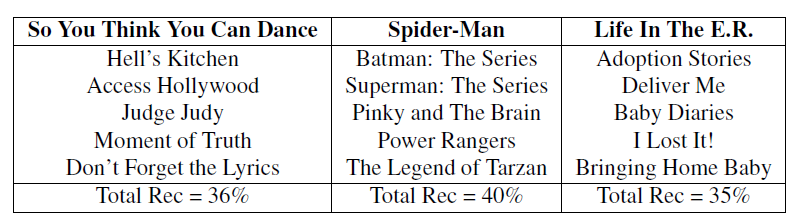 另外,我们还报告top 5 相似的、曾经观看过的节目(即 5 个节目占比从 35% 到 40%,这表明用户看过的很多其它节目也有较大的贡献。