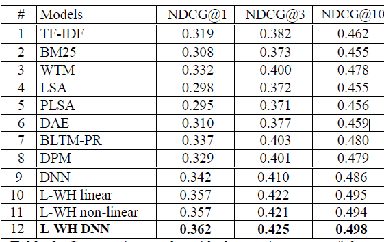 例如 DNN (第9行)和 DAE(第6行)使用相同的 40k-word 词表并采用相同的深度架构,前者在 NDCG@1 中比后者高出 0.032 。