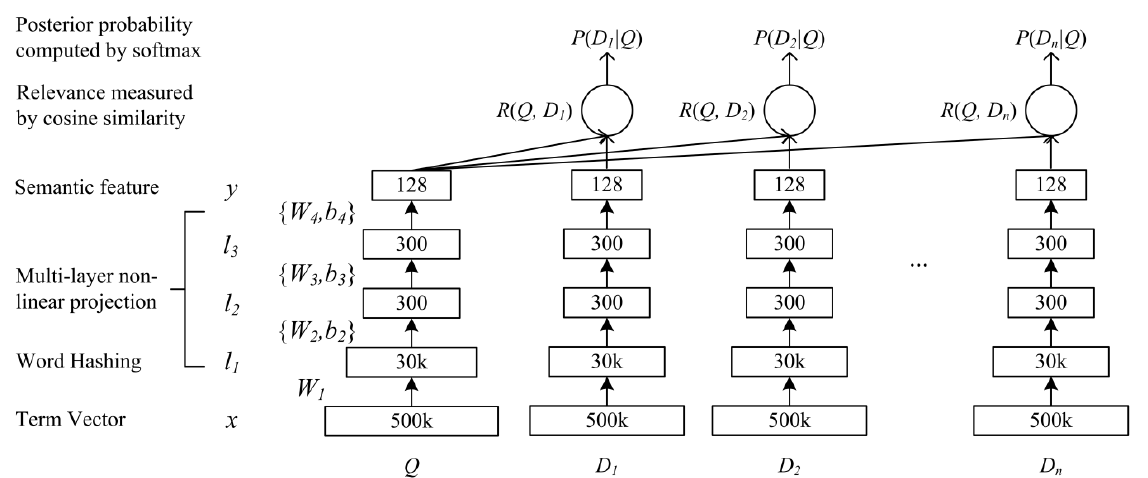 DNN 的输入(原始文本特征)是一个高维稀疏的 term vector ,如 query 或 document 中 term 未归一化的原始计数。输入层 500k 表示采用 500k 个单词的大型词表。