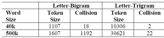当该技术应用于更大规模的词表时,维度的降低更为显著。如下表所示,500K-word 词表中每个单词都可以使用 letter trigrams 由一个 30621 维的向量来表示,维度降低了 16 倍,而且冲突率 0.0044%(22/500000)几乎可以忽略不计。