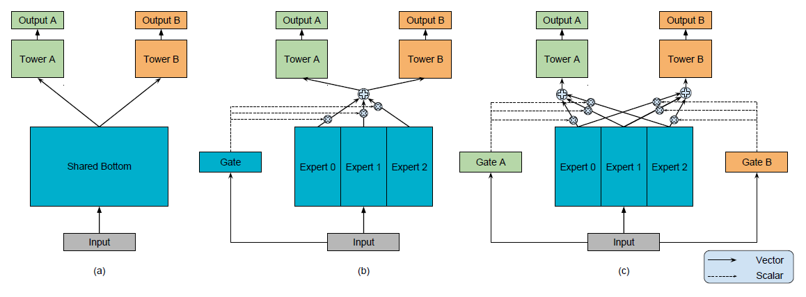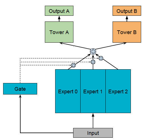 在论文 《Modeling Task Relationships in Multi-task Learning with Multi-gate Mixture-of-Experts》 中,我们提出了一种新颖的、基于 Multi-gate Mixture-of-Expert: MMoE 结构的多任务学习方法,该方法受到Mixture-of-Expert: MoE 模型和最近的 MoE layer 的启发。