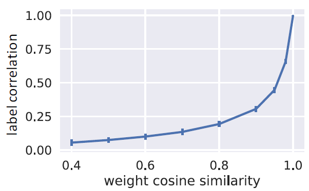 此时 weight cosine similarity (横轴,即 10k 个带有两个标签的数据点,并计算这两个标签之间的皮尔逊相关系数。我们我们重复这个过程,并绘制均值,其中 error bar 表示 100 次实验中标准差的 2 倍。