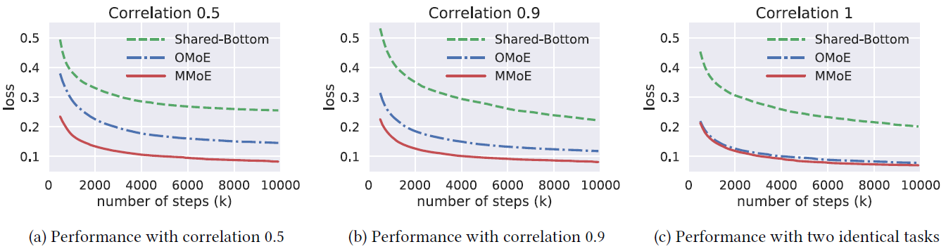 在具有不同相关性的数据上,MMoE 模型的性能差距要远小于 OMoE 模型和Shared-Bottom 模型。当我们将 MMoE 模型和 OMoE 模型进行比较时,这种趋势尤为明显: