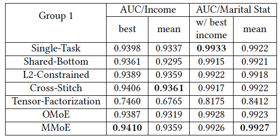 我们进一步评估了 MMoE 在benchmark 数据集(UCI Census-income 数据集)上的性能,该数据集具有多任务的配置。我们比较了几种 state-of-the-art 的多任务模型,这些模型通过软参数共享soft parameter sharing 来建模任务关系,并观察到MMOE 方法的提升。
