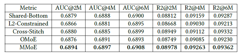 其次,和Shared-Bottom模型相比,通过使用 MMoE 模型,我们同时提升了这两个指标。