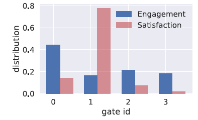 由于satisfaction子任务的标签比engagement 子任务的标签更加稀疏,因此satisfaction子任务的gate 更多地聚焦于单个专家上。