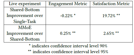 首先,和单任务模型相比,通过使用Shared-Bottom模型,我们看到在线satisfaction指标大幅提升了 19.72% 、在线engagement 指标略有下降(-0.22% )。