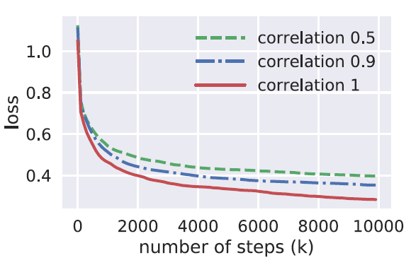 任务相关系数为 1.0 表示两个任务具有完全相同的权重向量,但是具有各自独立的噪声。 横轴表示训练 step 的数量,纵轴表示 200 次独立运行的平均 loss 。注意:这两个回归任务是对称的,因此只需报告一个任务的结果即可。